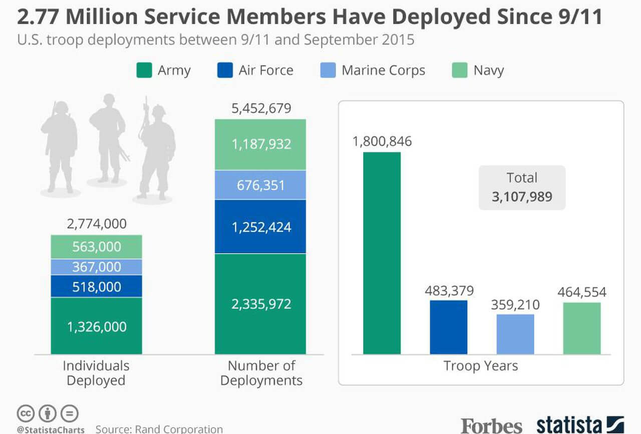 Seventeen years at war with a volunteer military has resulted in U.S. soldiers being deployed multiple times more than any other time in modern history. According to a recent Rand Corporation report, 2.77 million service members have been deployed on 5.4 million deployments since 9/11, with around 225,000 Army soldiers having been deployed at least three times or more. The DoD reported that between 2000 and September 2017, about 173,000 active-duty service members were diagnosed with PTSD in the military health system, with about 139,000 of those being diagnosed following a deployment of 30 days or more. According to the DoD, PTSD is treatable, and many service members will recover with appropriate treatment. However, many do not.